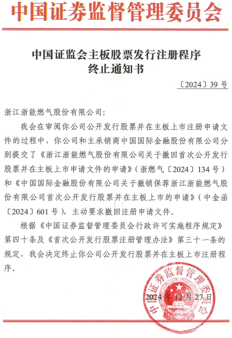 根据《中国证券监督管理委员会行政许可实施程序规定》第四十条及《首次公开发行股票注册管理办法》第三十一条的规定,中国证监会决定终止浙能燃气公开发行股票并在主板上市注册程序。