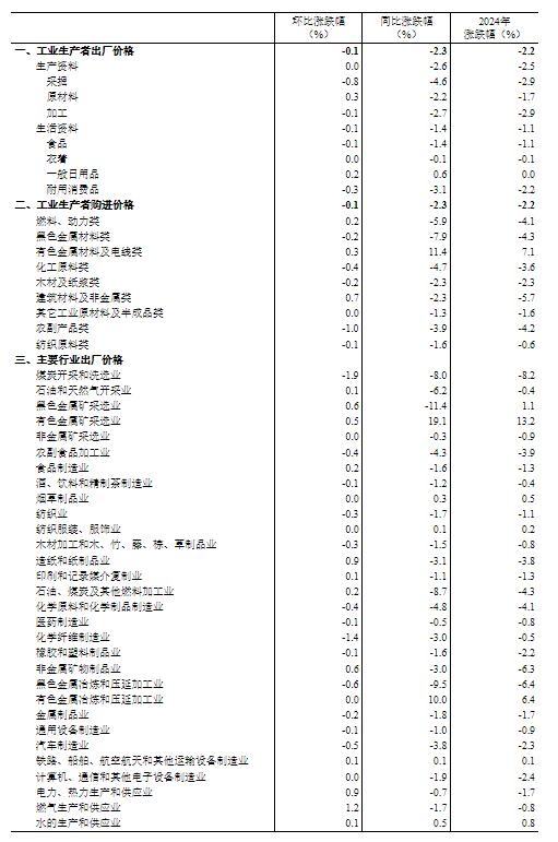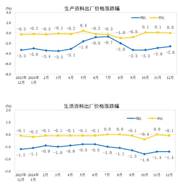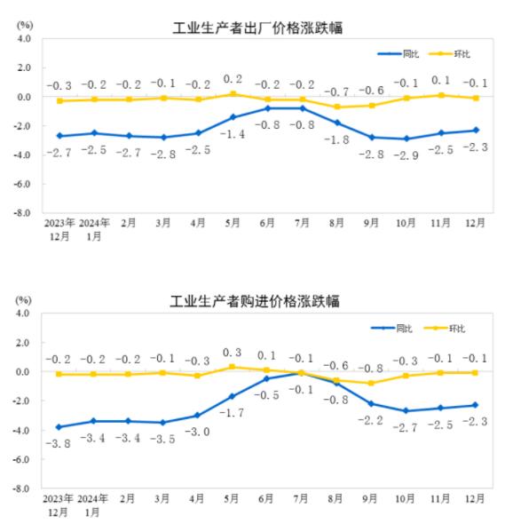 2024年12月份,全国工业生产者出厂价格和购进价格同比均下降2.3%,降幅比上月均收窄0.2个百分点;环比均下降0.1%。2024年全年,工业生产者出厂价格和购进价格均下降2.2%,降幅比上年分别收窄0.8、1.4个百分点。