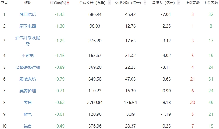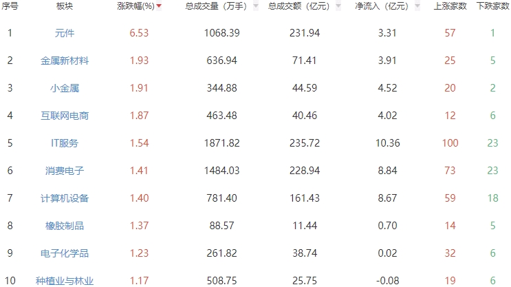 板块方面,元件、金属新材料、小金属等板块涨幅居前,港口航运、厨卫电器、油气开采及服务等板块跌幅居前。