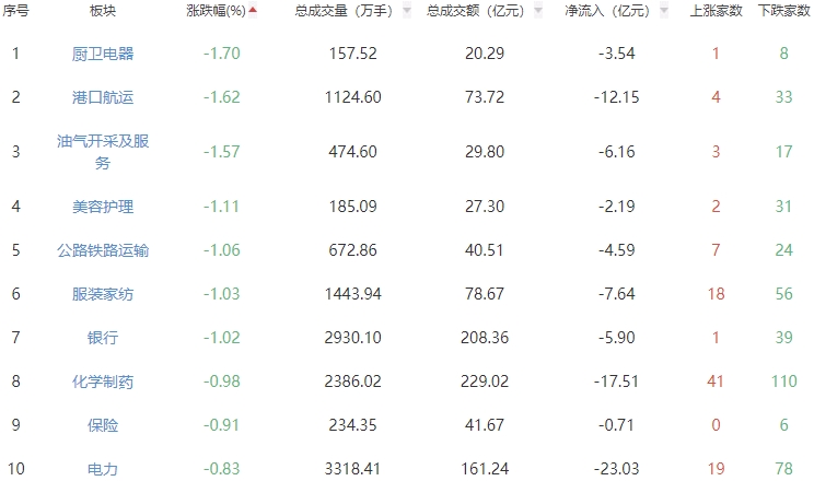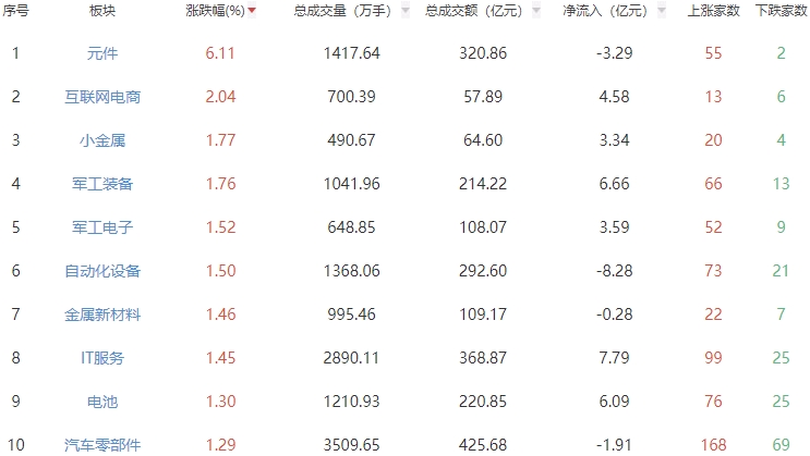 板块方面,元件、互联网电商、小金属等板块涨幅居前,厨卫电器、港口航运、油气开采及服务等板块跌幅居前。