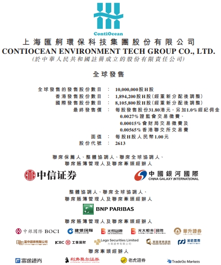 汇舸环保的最终发售价为31.80港元,所得款项总额为318.0百万港元,扣除按最终发售价计算的预计应付上市开支后,所得款项净额为273.4百万港元。