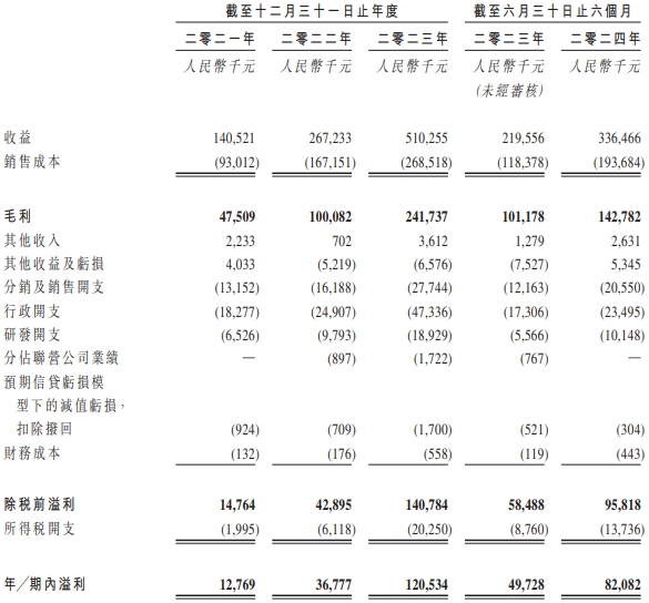 2021年、2022年、2023年及2024年1-6月,汇舸环保的收益分别为1.41亿元、2.67亿元、5.10亿元及3.36亿元,期内溢利分别为1276.9万元、3677.7万元、1.21亿元和8208.2万元。