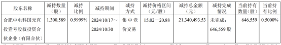 公司于2025年1月9日收到股东中电科国元直投壹号发来的《关于股份减持计划实施情况的告知函》。截至2025年1月9日,本次减持计划的减持时间区间已届满,股东中电科国元直投壹号在减持计划期间内(2024/10/17-2024/10/30)减持公司股票1,300,589股,占截至其减持计划披露日公司总股本(130,068,930股)的0.9999%,减持价格区间为15.02至20.88元/股,减持总金额为21,340,493.53元。