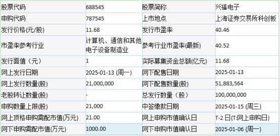 兴福电子于2025年1月10日发布的首次公开发行股票并在科创板上市发行公告显示,公司本次募投项目预计使用募集资金金额为121,000.00万元。按本次发行价格11.68元/股和10,000.00万股的新股发行数量计算,若本次发行成功,预计公司募集资金总额116,800.00万元,扣除约9,695.56万元(不含增值税)的发行费用后,预计募集资金净额107,104.44万元(如有尾数差异,为四舍五入所致)。