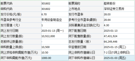 超研股份于2025年1月10日发布的首次公开发行股票并在创业板上市发行公告显示,若本次发行成功,按本次发行价格6.70元/股计算,预计公司募集资金总额为43,047.13万元,扣除发行费用4,610.80万元(不含增值税)后,预计募集资金净额约为38,436.33万元。