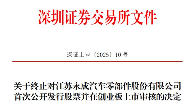 中国经济网北京1月13日讯 深交所网站日前公布关于终止对江苏永成汽车零部件股份有限公司(简称“江苏永成”)首次公开发行股票并在创业板上市审核的决定。
