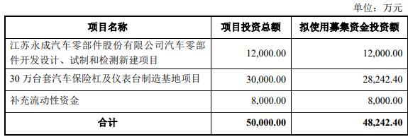江苏永成原拟在深交所创业板公开发行新股不超过3,922.5491万股,原拟募集资金48,242.40万元,计划用于“江苏永成汽车零部件股份有限公司汽车零部件开发设计、试制和检测新建项目”、“30万台套汽车保险杠及仪表台制造基地项目”、“补充流动性资金”。