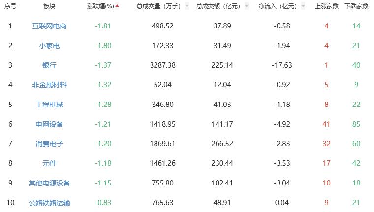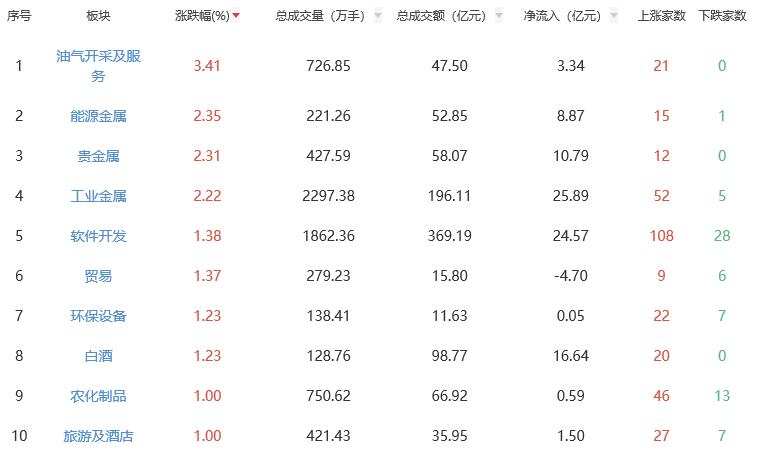 板块方面,油气开采及服务、能源金属、贵金属涨幅居前,互联网电商、小家电、银行跌幅居前。