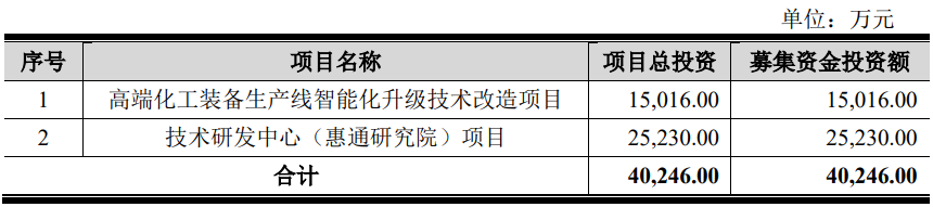 惠通科技本次发行募集资金总额为41,441.60万元,扣除发行费用后实际募集资金净额为35,371.79万元,公司最终募集资金净额比原计划少4,874.21万元。惠通科技2024年1月10日披露的招股书显示,公司拟募集资金40,246.00万元,用于高端化工装备生产线智能化升级技术改造项目、技术研发中心(惠通研究院)项目。