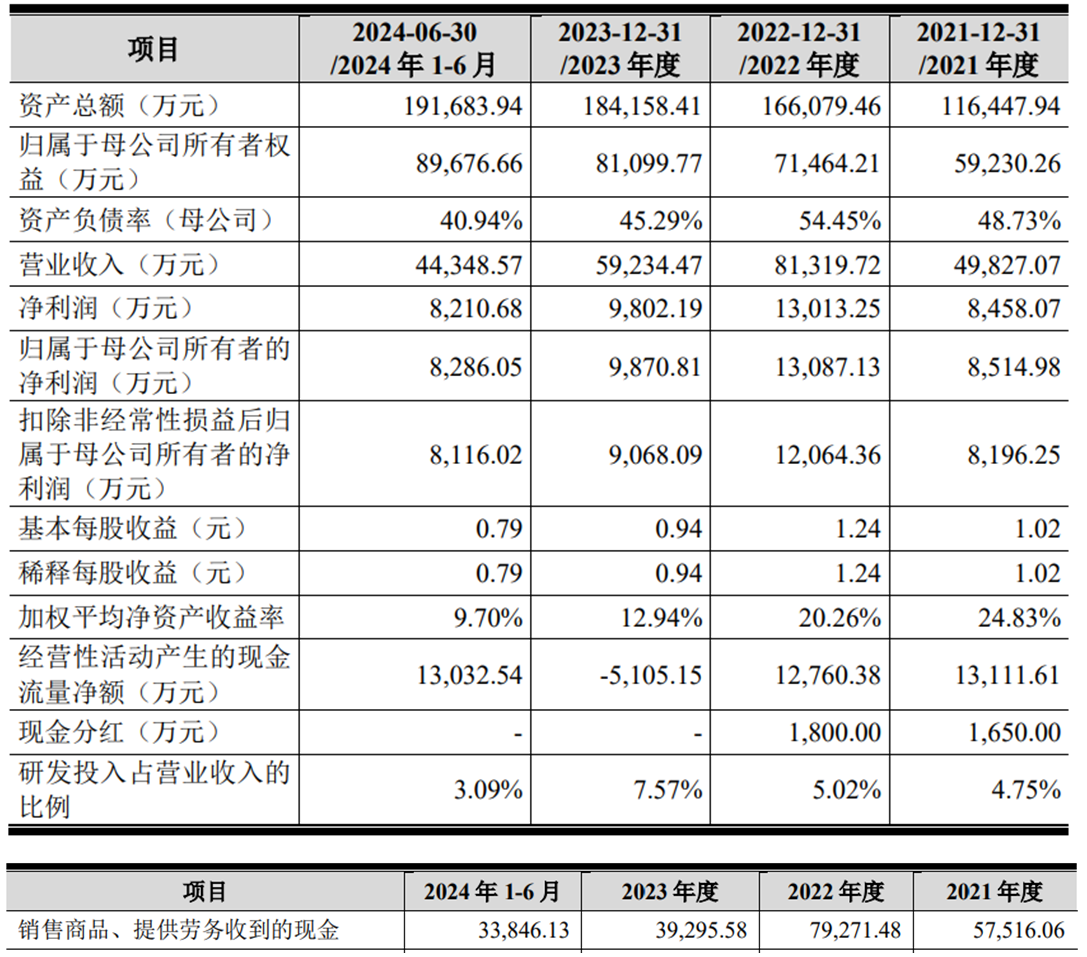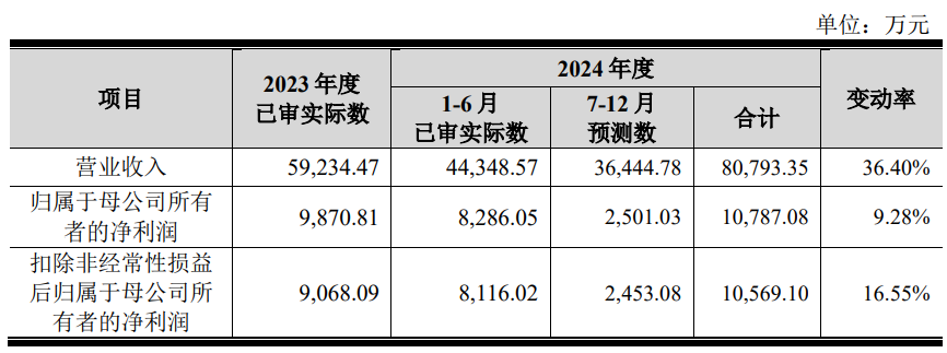 公司预测2024年度实现营业收入80,793.35万元,同比增长36.40%;预测2024年度归属于母公司所有者的净利润为10,787.08万元,同比增长9.28%;预测2024年度扣除非经常性损益后归属于母公司所有者的净利润为10,569.10万元,同比增长16.55%。