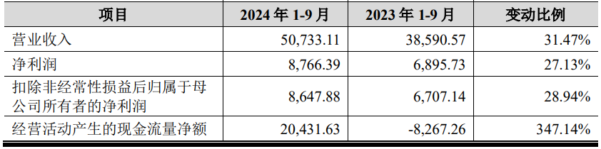 2024年1-9月,惠通科技实现营业收入50,733.11万元,同比增长31.47%;实现净利润8,766.39万元,同比增长27.13%;扣除非经常性损益后归属于母公司所有者的净利润8,647.88万元,同比增长28.94%;公司经营活动产生的现金流量净额20,431.63万元,上年同期为-8,267.26万元。