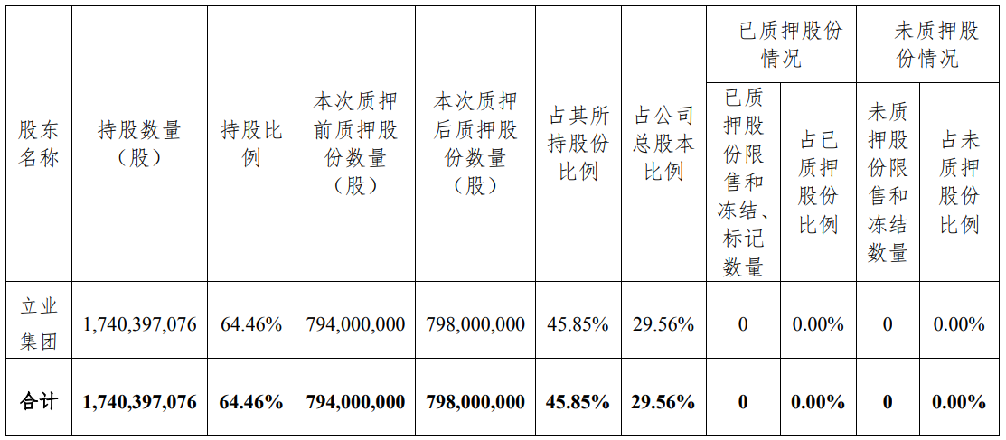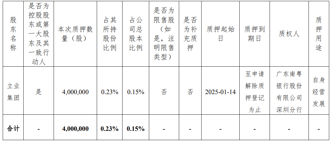 立业集团将其持有的华林证券400.00万股股份进行质押,本次质押占其所持股份比例为0.23%,股数占公司总股本比例0.15%。