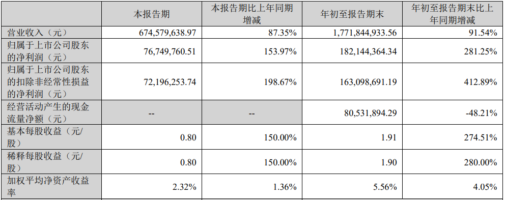 2024年前三季度,达瑞电子实现营业收入17.72亿元,同比增长91.54%;归属于上市公司股东的净利润1.82亿元,同比增长281.25%;归属于上市公司股东的扣非净利润1.63亿元,同比增长412.89%;经营活动产生的现金流量净额为8053.19万元,同比下降48.21%。