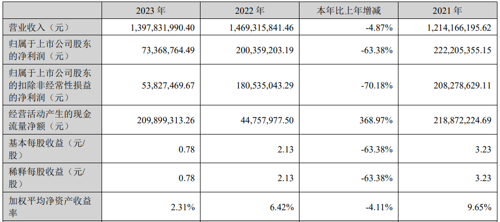 2023年,达瑞电子实现营业收入13.98亿元,同比下降4.87%;归属于上市公司股东的净利润7336.88万元,同比下降63.38%;归属于上市公司股东的扣非净利润5382.75万元,同比下降70.18%;经营活动产生的现金流量净额2.10亿元,同比增长368.97%。