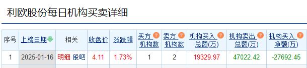 利欧股份龙虎榜:机构净卖出2.77亿元