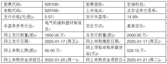 2025年1月15日,宏海科技发布的向不特定合格投资者公开发行股票并在北京证券交易所上市发行公告显示,若本次发行成功,超额配售选择权行使前,预计公司募集资金总额为11,140.00万元,扣除发行费用1,849.14万元(不含增值税)后,预计募集资金净额为9,290.86万元;若超额配售选择权全额行使,预计公司募集资金总额为12,811.00万元,扣除预计发行费用1,983.23万元(不含增值税)后,预计募集资金净额为10,827.77万元。