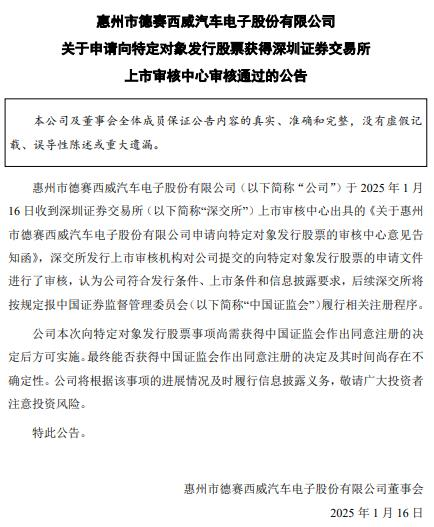 中国经济网北京1月17日讯 德赛西威(002920.SZ)昨晚披露关于向特定对象发行股票获得深圳证券交易所上市审核中心审核通过的公告。