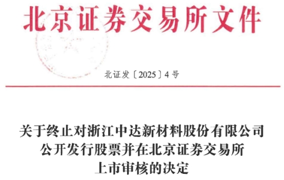 2025年1月2日,中达新材向北交所提交了《浙江中达新材料股份有限公司关于撤回浙江中达新材料股份有限公司向不特定合格投资者公开发行股票并在北交所上市项目申请文件的申请》,申请撤回申请文件。根据《北京证券交易所向不特定合格投资者公开发行股票并上市审核规则》第五十五条的有关规定,北交所决定终止中达新材公开发行股票并在北京证券交易所上市的审核。
