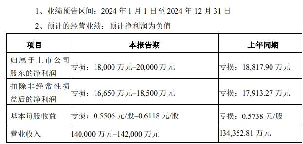 中国经济网北京1月20日讯 中欣氟材(002915.SZ)17日晚披露2024年年度业绩预告,2024年,公司归属于上市公司股东的净利润预计亏损18,000万元至20,000万元,上年同期亏损18,817.90万元;扣除非经常性损益后的净利润预计亏损16,650万元至18,500万元,上年同期亏损17,913.27万元;基本每股收益预计亏损0.5506元/股至0.6118元/股,上年同期亏损0.5738元/股;营业收入 预计140,000万元至142,000万元,上年同期134,352.81万元。