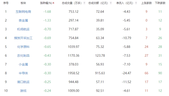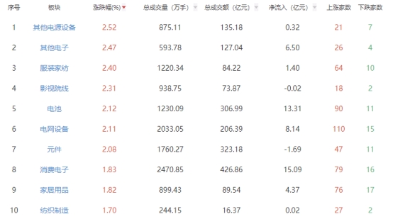 板块方面,其他电源设备、其他电子、服装家纺等板块涨幅居前,互联网电商、贵金属、机场航运等板块跌幅居前。
