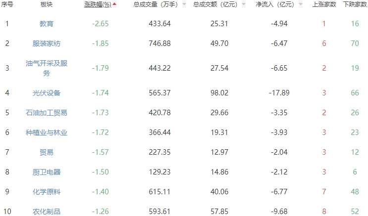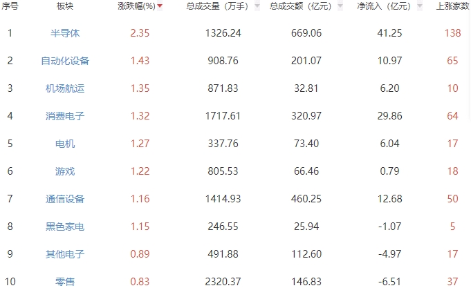 板块方面,半导体、自动化设备、机场航运等板块涨幅居前,教育、服装家纺、油气开采及服务等板块跌幅居前。