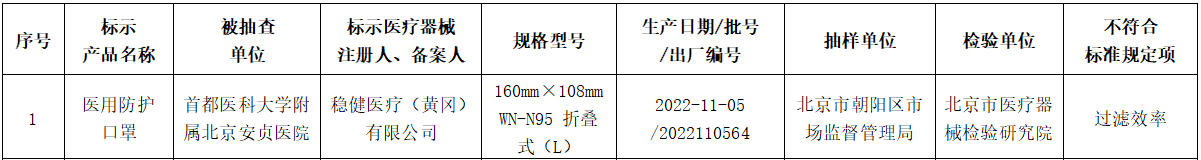 不符合规定产品共计6批次,其中,标示医疗器械注册人、备案人为稳健医疗(黄冈)有限公司的医用防护口罩不符合标准规定项为过滤效率,规格型号为160mm×108mm WN-N95 折叠式(L),生产日期/出厂编号为2022-11-05/2022110564,被抽查单位为首都医科大学附属北京安贞医院,检验单位为北京市医疗器械检验研究院。