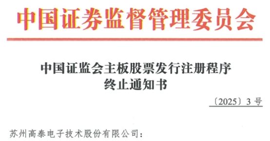 根据《中国证券监督管理委员会行政许可实施程序规定》第四十条及《首次公开发行股票注册管理办法》第三十一条的规定,证监会决定终止高泰电子公开发行股票并在主板上市注册程序。