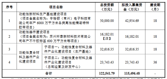高泰电子原拟在上交所主板发行不超过17,302,100股(不考虑超额配售选择权),占本次发行后总股本的比例不低于25%。公司原拟募集资金115,496.48万元,分别用于功能性新材料生产基地建设项目、功能性器件建设项目、功能性复合材料及器件产业化建设项目。