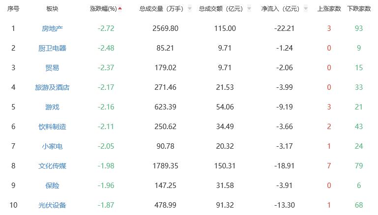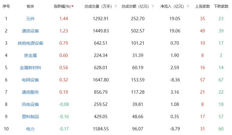板块方面,元件、通信设备、其他电源设备涨幅居前,房地产、厨卫电器、贸易跌幅居前。