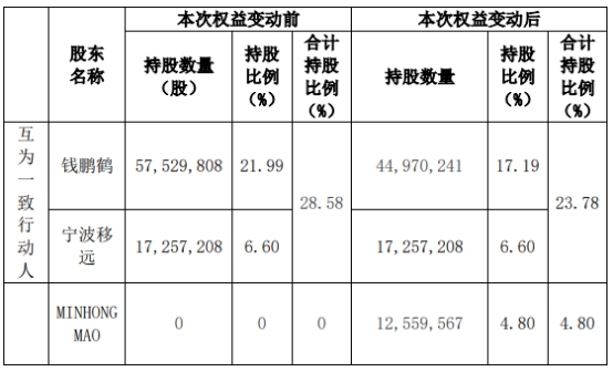 本次权益变动后,钱鹏鹤持有公司股份44,970,241股,持股比例为17.19%;宁波移远持有公司股份17,257,208股,持股比例为6.60%;钱鹏鹤与宁波移远合计持有公司62,227,449股股份,合计持股比例为23.78%。