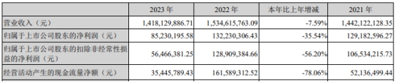 2023年,金丹科技实现营业收入14.18亿元,同比下降7.59%;归属于上市公司股东的净利润8523.02万元,同比下降35.54%;归属于上市公司股东的扣除非经常性损益的净利润5646.64万元,同比下降56.20%;经营活动产生的现金流量净额3544.58万元,同比下降78.06%。