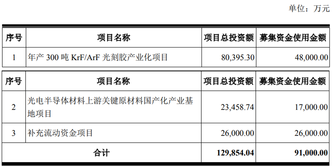 鼎龙股份2024年12月30日披露的向不特定对象发行可转换公司债券募集说明书(申报稿)显示,本次可转换公司债券拟募集资金总规模不超过人民币91,000.00万元(含91,000.00万元),扣除发行费用后,本次募集资金将用于“年产300吨KrF/ArF光刻胶产业化项目”、“光电半导体材料上游关键原材料国产化产业基地项目”和“补充流动资金项目”。
