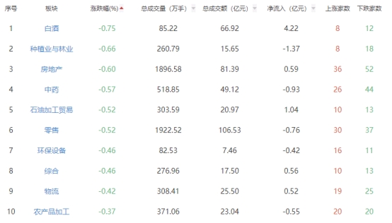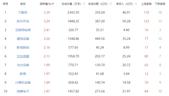 板块方面,IT服务、软件开发、互联网电商等板块涨幅居前,白酒、种植业与林业、房地产等板块跌幅居前。