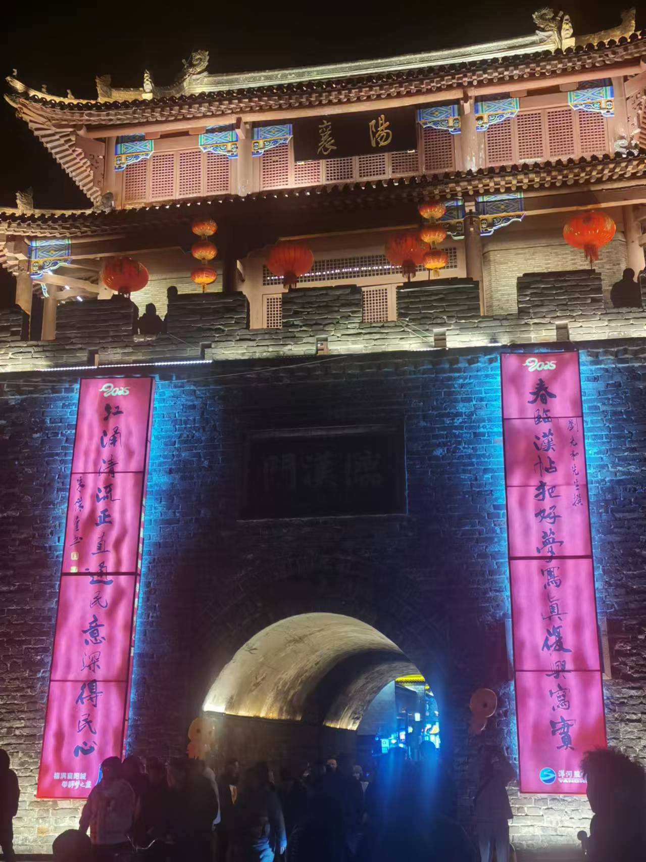 新年夜,襄阳市古城墙内外洋溢着浓浓的年味。白天,这座历史悠久的城墙在阳光的照耀下更显古朴庄重。城墙下,一幅幅用毛笔精心书写的襄阳城古诗挂置其间,古朴的字迹与城墙的沧桑相得益彰,仿佛在诉说着这座城市的故事。城门两侧,红彤彤的年画高高悬挂,寓意着吉祥如意,为来往的行人送上新年的祝福。