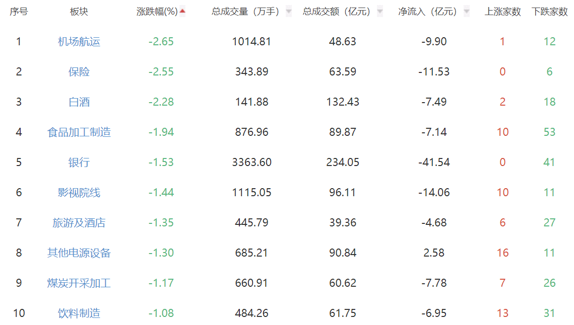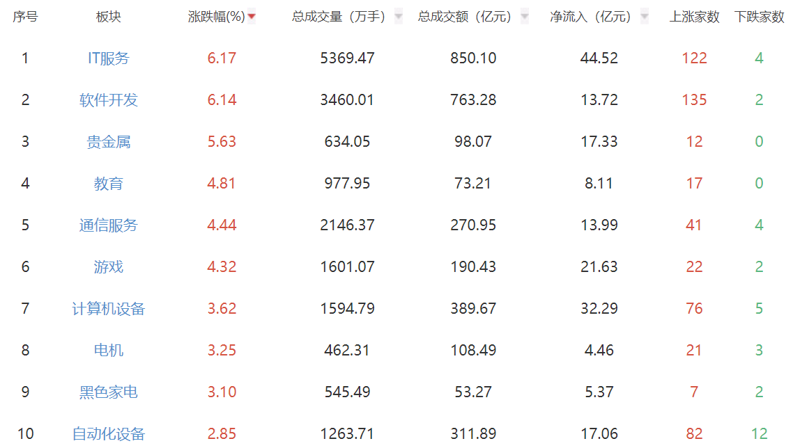 板块方面,IT服务、软件开发、贵金属等板块涨幅居前,机场航运、保险、白酒等板块跌幅居前。
