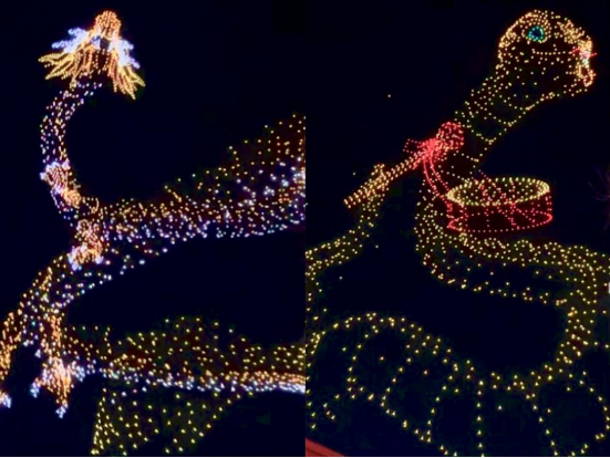 夜幕降临,三千架无人机腾空而起,在星空之下灵动变幻,拼出“龙蛇共舞”“福满人间”等极具新春寓意的光影画卷,令游客叹为观止。