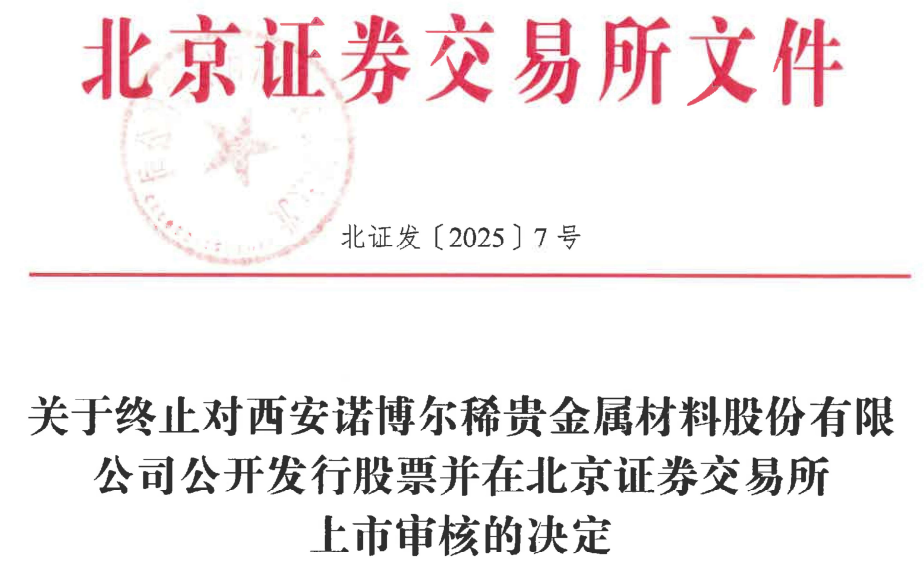 中国经济网北京2月8日讯 北交所网站昨晚披露关于终止对西安诺博尔稀贵金属材料股份有限公司(简称“西诺稀贵”)公开发行股票并在北京证券交易所上市审核的决定。