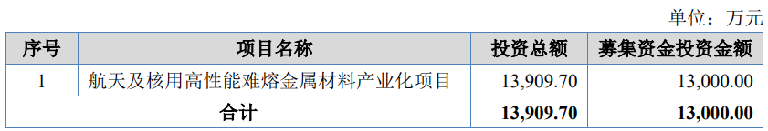 西诺稀贵原拟募集资金13,000.00万元,用于航天及核用高性能难熔金属材料产业化项目。