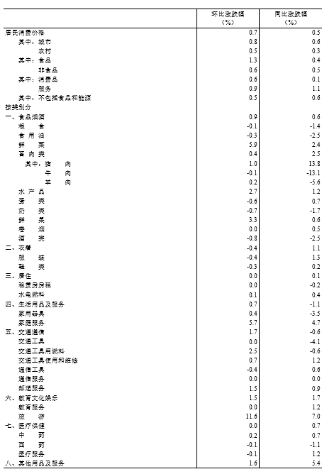 2025年1月份,全国居民消费价格同比上涨0.5%。其中,城市上涨0.6%,农村上涨0.3%;食品价格上涨0.4%,非食品价格上涨0.5%;消费品价格上涨0.1%,服务价格上涨1.1%。