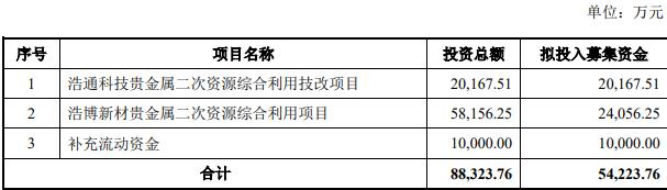 公司本次向不特定对象发行可转债拟募集资金总额不超过54,223.76万元(含),扣除发行费用后将用于浩通科技贵金属二次资源综合利用技改项目、浩博新材贵金属二次资源综合利用项目、补充流动资金。