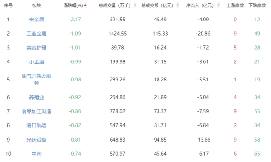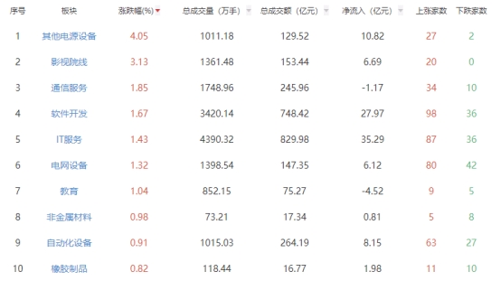 板块方面,其他电源设备、影视院线、通信服务等板块涨幅居前,贵金属、工业金属、美容护理等板块跌幅居前。