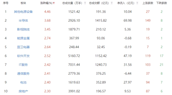 板块方面,其他电源设备、半导体、影视院线等板块涨幅居前,贵金属、工业金属、油气开采及服务等板块跌幅居前。