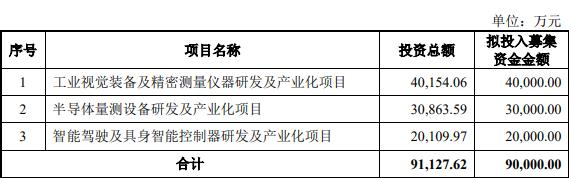 本次发行的募集资金总额不超过90,000.00万元(含),扣除发行费用后,拟全部用于工业视觉装备及精密测量仪器研发及产业化项目、半导体量测设备研发及产业化项目、智能驾驶及具身智能控制器研发及产业化项目。