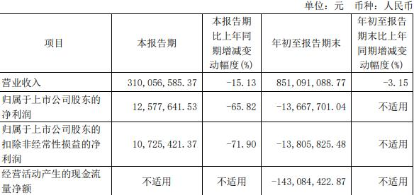 据公司2024年三季报,去年年初至报告期末,公司实现营业收入8.51亿元,同比减少3.15%;实现归属于上市公司股东的净利润-1366.77万元;实现归属于上市公司股东的扣除非经常性损益的净利润-1380.58万元;经营活动产生的现金流量净额为-1.43亿元。
