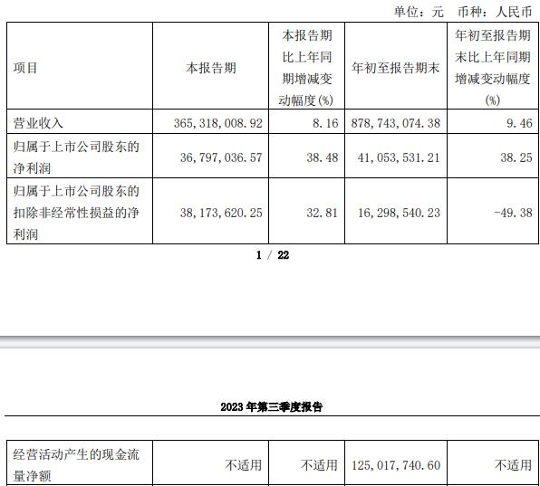 据公司2023年三季报,2023年年初至报告期末,公司实现实现归属于上市公司股东的净利润4105.35万元,同比增长38.35%;实现归属于上市公司股东的扣除非经常性损益的净利润1629.85万元,同比减少49.38%。