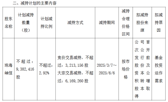 股东珠海岫恒股权投资合伙企业(有限合伙)(以下简称“珠海岫恒”)因基金投资运作需求,拟通过集中竞价交易及大宗交易的方式减持其所持有的公司股份合计不超过9,382,416股,本次减持比例合计不超过公司总股本2.92%,自减持计划公告之日起15个交易日后的3个月内(2025年3月7日至2025年6月6日)实施。