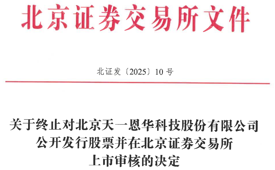 2024年12月31日,天一恩华向北交所提交了《北京天一恩华科技股份有限公司关于撤回北京天一恩华科技股份有限公司向不特定合格投资者公开发行股票并在北交所上市项目申请文件的申请》,申请撤回申请文件。根据《北京证券交易所向不特定合格投资者公开发行股票并上市审核规则》第五十五条的有关规定,北交所决定终止天一恩华公开发行股票并在北京证券交易所上市的审核。