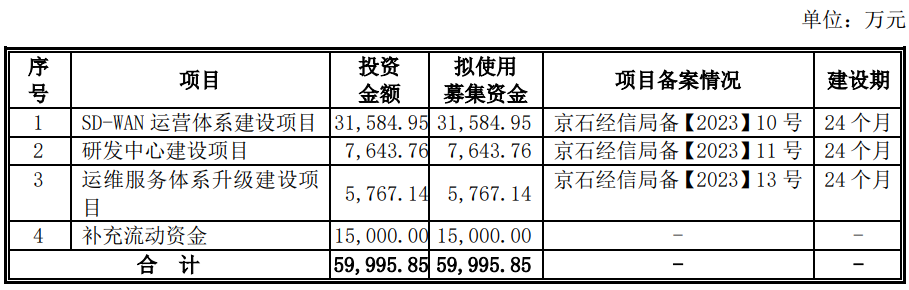 天一恩华原拟在北交所向不特定合格投资者公开发行股票不超过3,988.00万股(未考虑超额配售选择权的情况下),或不超过4,586.20万股(全额行使本次股票发行的超额配售选择权的情况下),且发行后公众股东持股占发行后总股本的比例不低于25%。公司原拟募集资金59,995.85万元,用于SD-WAN运营体系建设项目、研发中心建设项目、运维服务体系升级建设项目、补充流动资金。