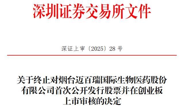 日前,迈百瑞向深交所提交了《烟台迈百瑞国际生物医药股份有限公司关于撤回首次公开发行股票并在创业板上市申请文件的申请》,保荐人向深交所提交了《华泰联合证券有限责任公司关于撤回烟台迈百瑞国际生物医药股份有限公司首次公开发行股票并在创业板上市的申请》。根据《深圳证券交易所股票发行上市审核规则(2024年修订)》第六十二条的有关规定,深交所决定终止对迈百瑞首次公开发行股票并在创业板上市的审核。