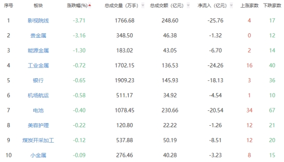 板块方面,教育、医疗服务、种植业与林业等板块涨幅居前,影视院线、贵金属、能源金属等板块跌幅居前。